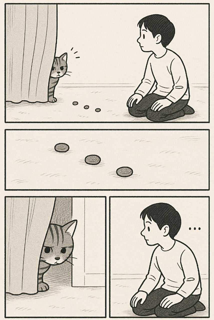 普段から、猫がどこにいるか頑張って探さずに、猫がいても一生懸命見ずに、猫がおやつを食べに人のそばに来られたらいいな、と思いながら、漫画のようにおやつを部屋において、猫のスピードに任せて距離を縮めるための練習をやってみましょう。